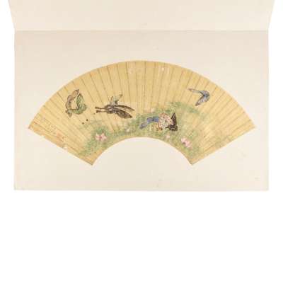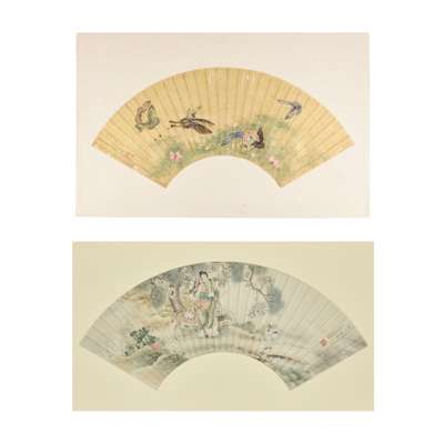 both ink and colour on paper, one depicting butterflies with peach blossom, the other depicting the female deity Magu with deer and stork, with inscriptions, signatures and seals, fan-shaped album leaf, one framed (2)