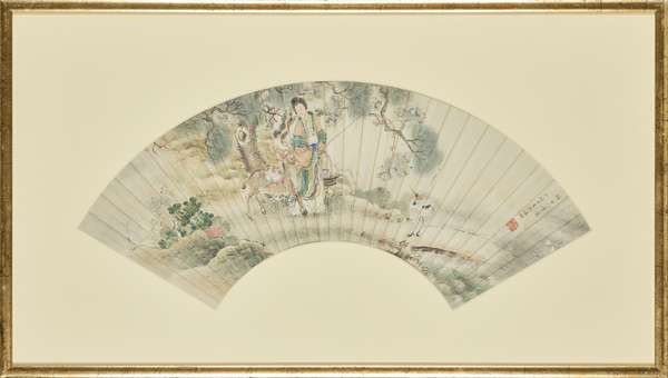清 吳小荷/祿卿款 麻姑圖 水墨設色紙本 扇頁鏡框 及 蝶戀花圖 水墨設色紙本 扇頁鏡心 (共兩幅)