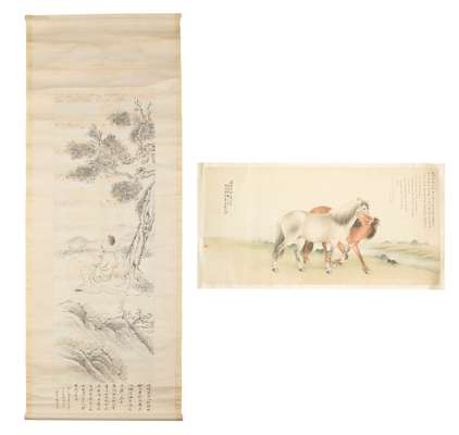 one by Yin Minren, ink and colour on paper, depicting two horses, with seal and signature, dated to 1915, large handscroll; the other ink on paper depicting a figure under tree, inscription, hanging scroll, both dedicated and given to Sir James S Lockhard by Wang Heqing (2)
