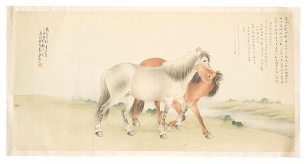 款識一:馬性如龍性,矯矯本不部群。蕭然冀北野,羈勒不加身。一自逢伯樂,邊感知已深。貢入天即中,飼養足芻薪。豈不自矝貴,未免失其真。何如此兩馬,瀟洒絕俗麈。駱公向有山林思想,祇以國家倚重未遂初服。鶴此次去而復返,亦以感公之知遇,耳視此不羈馬,得毋自歎弗如耶,此幀為鶴所贈公。恰屬馬故囑為題,莊子曰以馬喻馬,或其然▢爰賦以詩并綴數語質之。民國八年歲次己未孟冬,下浣題於威海客次。古越王鶴青氏。