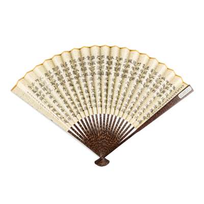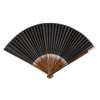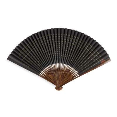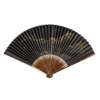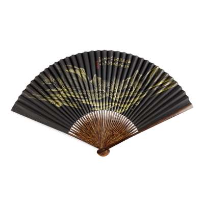 FAN 1: LANDSCAPE WITH VILLAGE, gold on black paper, signature and seal, bamboo guards;