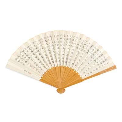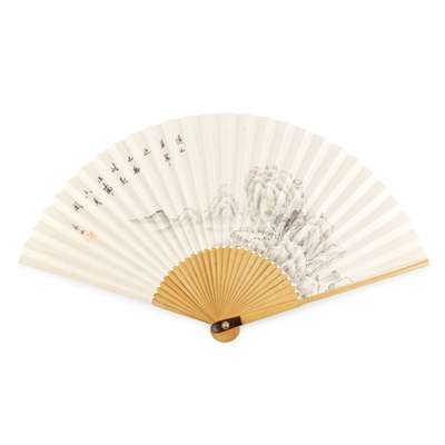 FAN 9: LANDSCAPE WITH MOUNTAINS AND SCHOLARS PAVILION, ink on paper, inscription, signature and seal by Mishan, bamboo guards;