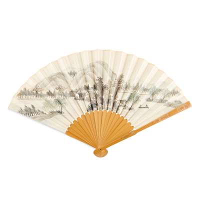 FAN 6: LANDSCAPE WITH HOUSES, LAKE AND BOAT, ink and colour on paper, bamboo guards, end-guard with relief carved seal;