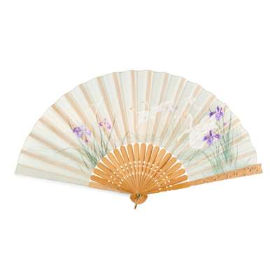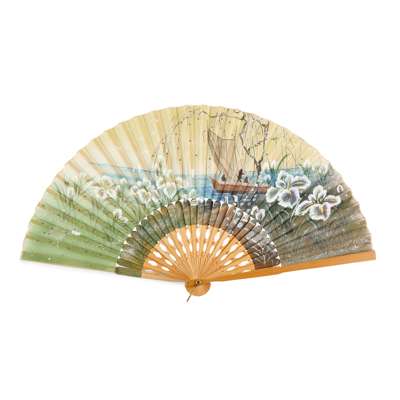 FAN 8: SEASCAPE WITH BOAT AND FLOWERS, ink and colour on gauze, speckled with silver, with pierced bamboo guards;