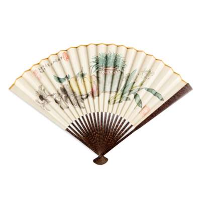 FAN 4: FRUIT, FLOWERS, VASE AND INSECT, ink and colour on paper, signature and seal of Qing Shouzhong, bamboo guards;