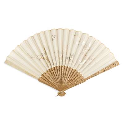 FAN 2: PEONY, ink and colour on paper, bamboo guards, stylised end-guard, inscribed and seal by Hong Yongzhou;