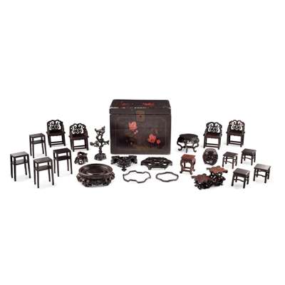 comprising: the furniture to including four armchairs, a set of four two-tier tables, a set of four low square tables and a small table with carved and shaped legs; a collection of ten hardwood stands, in an export lacquer box (24)