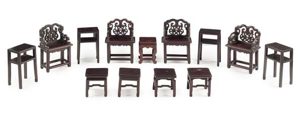 GROUP OF THIRTEEN CHINESE MINIATURE HARDWOOD FURNITURE AND TEN STANDS