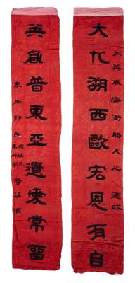 comprising: two vertical panels of a calligraphy couplet and three horizontal hangings, all with inscriptions praising Sir James Stewart Lockhart and dedicators, inscriptions in black velvet on red silk (5)