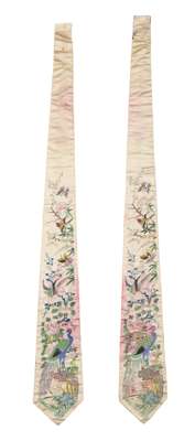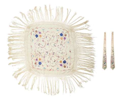 comprising: a silk shawl, worked in polychrome silks, the ivory coloured silk ground embroidered with flowers and stylised foliate trails, applied with a four-sided deep silk with a fringe along the narrowest edges; and two ties decorated with birds and flowers, each of tapered form with peacocks and flowers worked in brightly coloured silks on a blue ground (3)