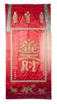 the large inscription ‘Shou’ worked in gold thread within a border of pale blue applied brocade, surmounted by The Gods of Three Stars, with a lower border of lion-dogs worked in gold thread