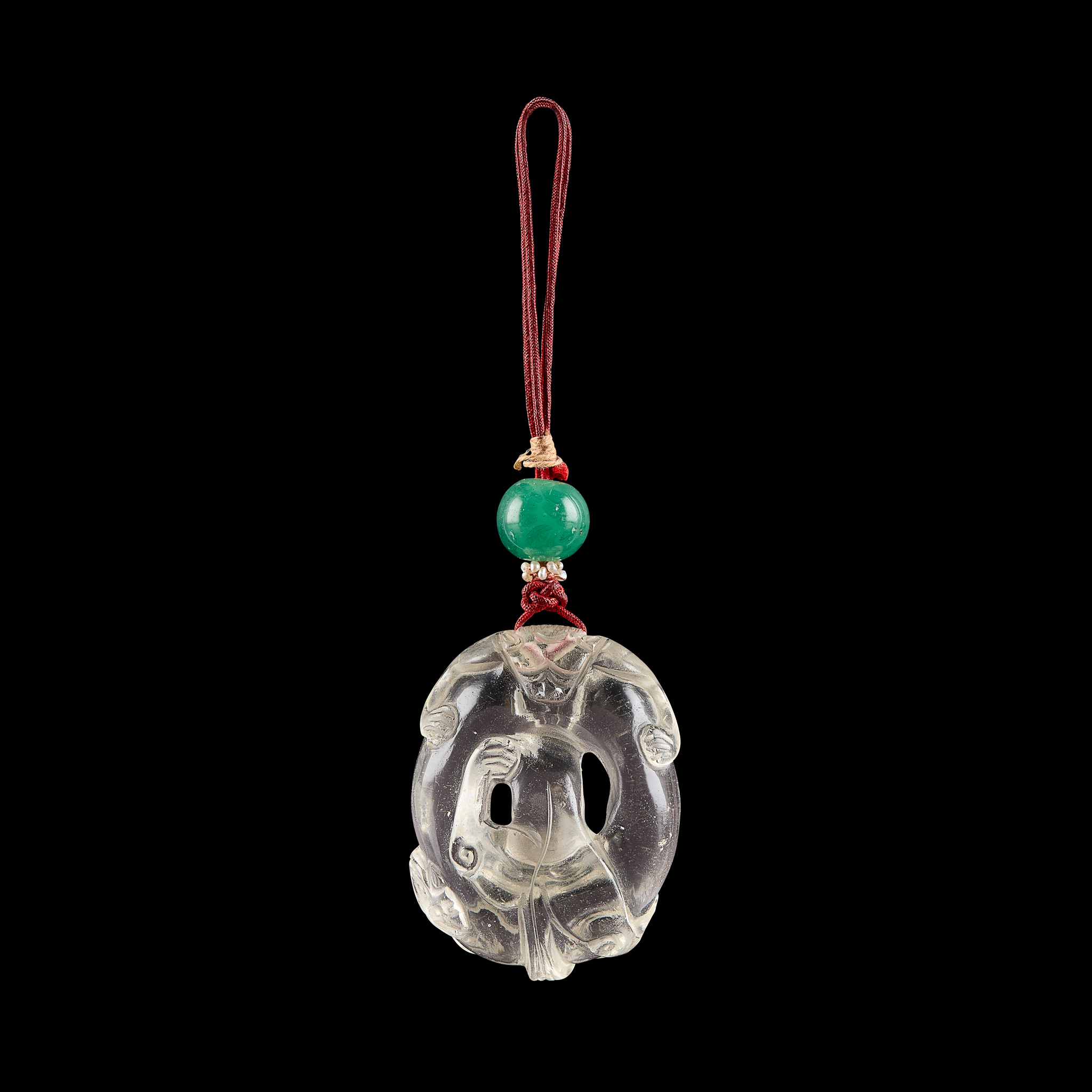 carved with a mythical beast clinging to a loop with its body going through the central opening, suspended by a green bead on a seed pearl and silk suspension chord