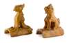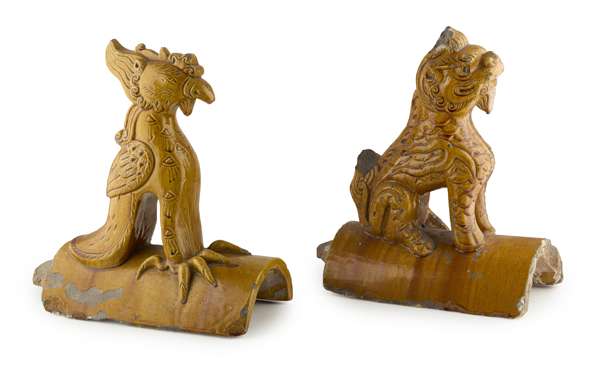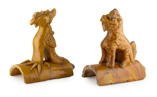 one moulded as a phoenix, and the other a mythical beast Xie Zhi, standing on semi-circular tiles, covered overall in a rich honey-amber glaze (2)
