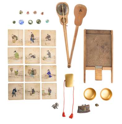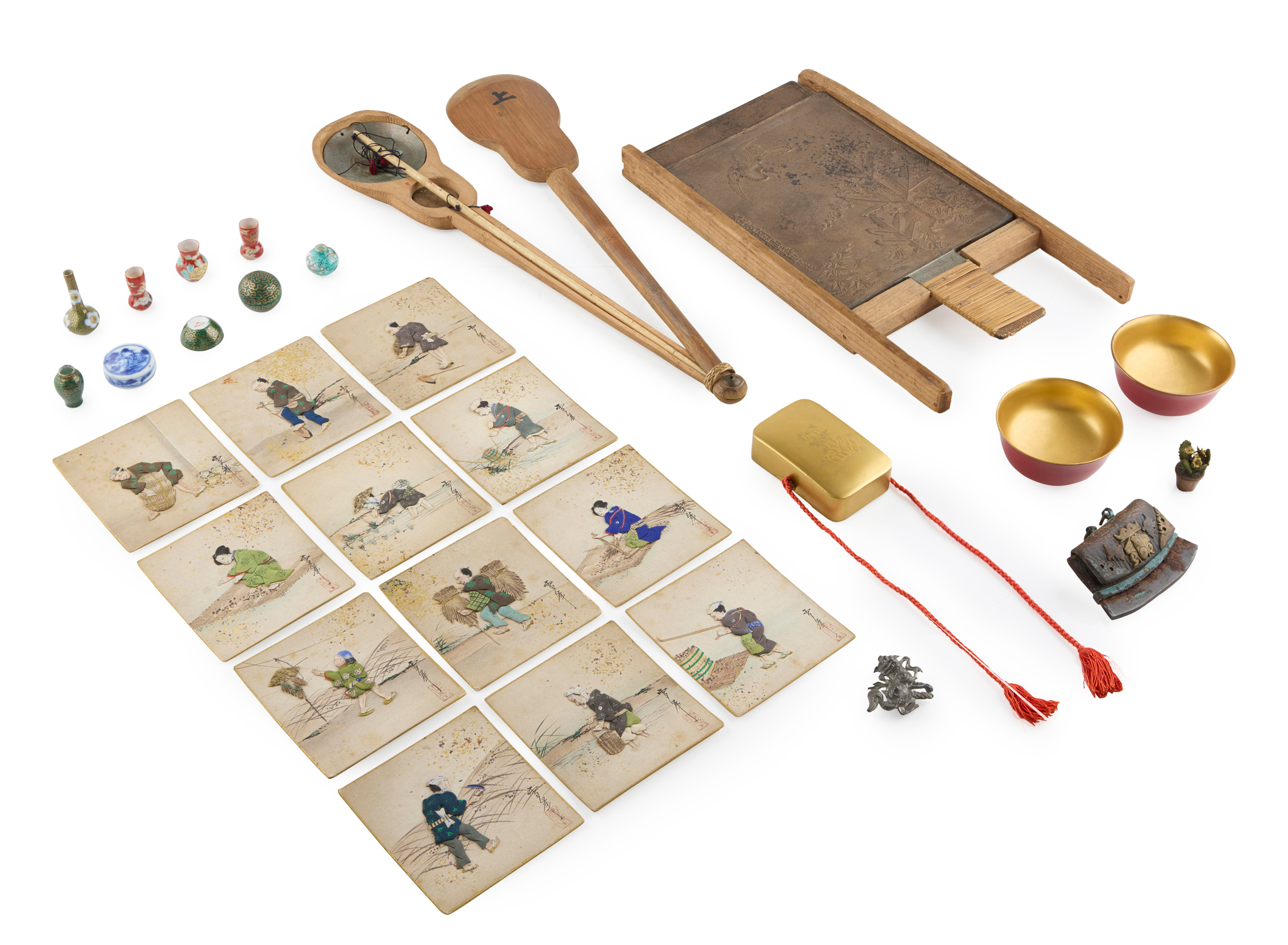 comprising: a group of eight Japanese miniature porcelains, including a lidded bowl, a bowl lacking a lid and six vases variously decorated, each underside transfer printed with a Mount Fuji device in underglaze red; a Japanese gold and red lacquer rectangular box and cover, the kinji ground decorated in gold takamakie with a flower spray, with red silk chord, together with two miniature red lacquered bowls; a Japanese rectangular bronze mirror and cover; a set of twelve Japanese appliqued figural paintings; a set of weighing scales, held in a carved wood guitar-shaped hinged case, with engraved balance supporting two brass dishes; a flint; a pressed silver 'toy' lion; a German painted lead flower pot, late 19th century (17)