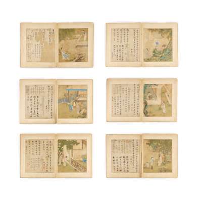 CHINESE ALBUM OF SIX 'ROMANCE' INK PAINTINGS WITH CALLIGRAPHIES