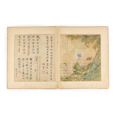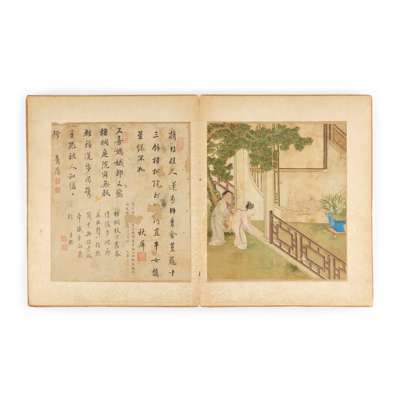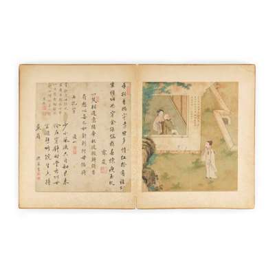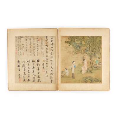 comprising six leaves of ink and water colour on silk, painted with romantic figures, each accompanied by a leaf of calligraphy by various appreciators, in a folded album