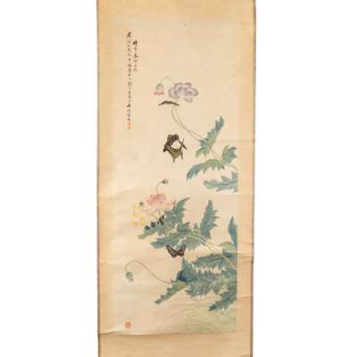 comprising: one ink and colour on paper, depicting a lady, by Xie Zhiguang, inscribed to left margin, dated to the year of Bing Xu, corresponding to 1946AD, signed and a seal of the artist; and one ink and colour on paper, depicting butterflies and flowers, inscribed upper left, signed Wu Hao, one seal ‘Wu Hao’, another ‘Meng Zhou’, both hanging scrolls (2)