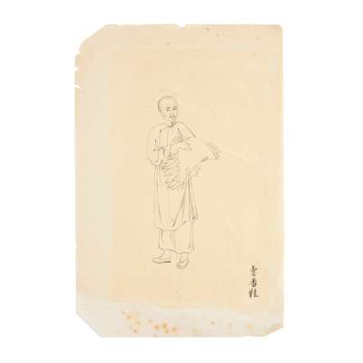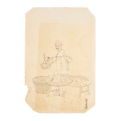comprising: three gouache on paper ‘junk' paintings; two ink on paper ‘one hundred occupations’ paintings, depicting a fruitmonger and shoes vendor; and one print on paper, depicting an official from Jiangsu, Yi Lianghu (6)