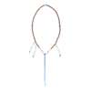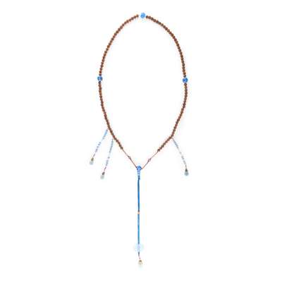 composed of one hundred and eight walnut beads each carved with various figures and scenes, spaced by four large translucent blue beads decorated, the central one suspending an oval-shaped pendant and dewdrop, further enhanced by three tassels, each terminating in a blue dewdrop