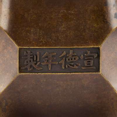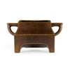 support on four feet, the rectangular body slightly recessed at the mouth, flanked by two angled handles, the convex base carved with a four-character apocryphal Xuande mark