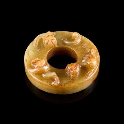 of archaistic disc bi form, one side carved in high relief with two lizard-like chi-dragons, the celadon stone with brown inclusions