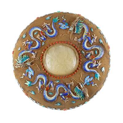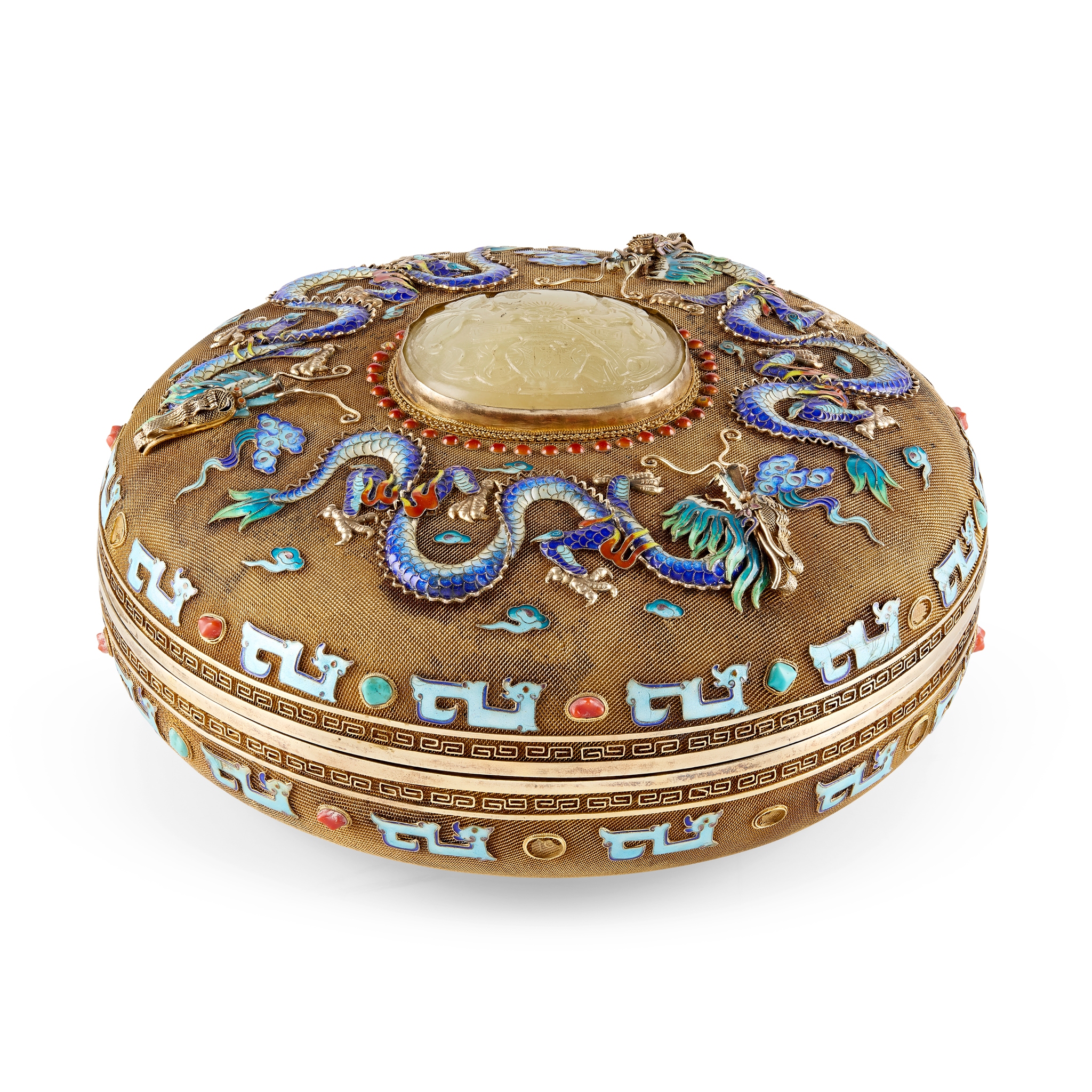 centre of the cover set with an oval celadon jade carved with prunus, pomegranate with basket, encircled by three enamelled and moulded dragons on a wire gauze textured gilt ground, the rims of cover and box inset with coral and turquoise coloured stones between archaic animals above key-fret bands