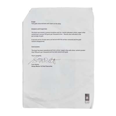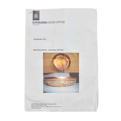 With an Analysis and Inspection Report from the Edinburgh Assay office dated 25 September 2012, indicating the piece is constructed of a silver copper alloy containing in excess of 958 parts per thousand silver and plated with gold.