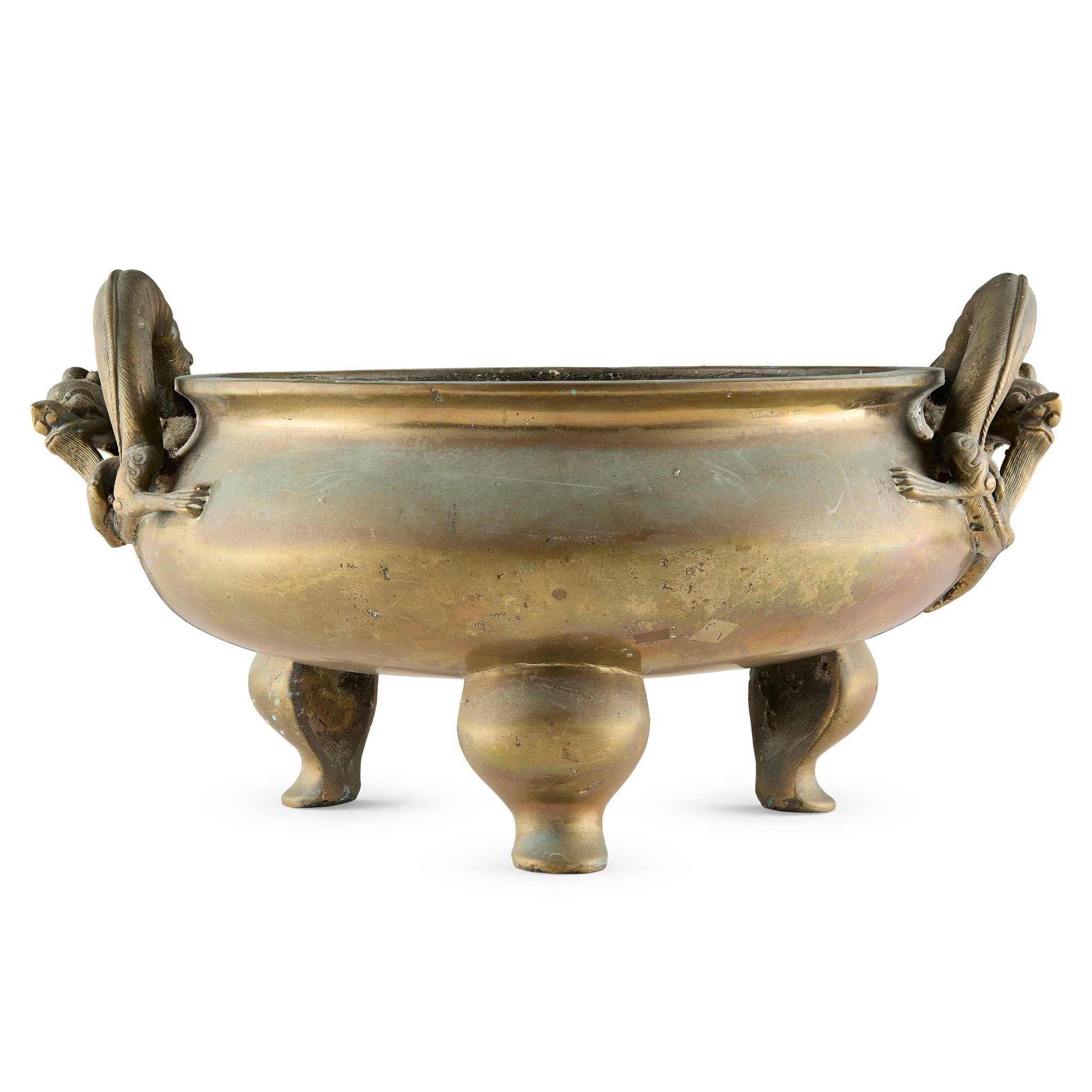 LARGE CHINESE BRONZE TRIPOD DRAGON-HANDLED CENSER