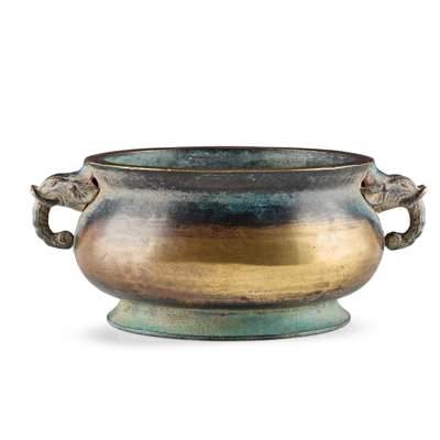 of compressed globular form raised on a short flaring ring foot, set on both sides with elephant heads as loop handles, the base with a six-character Xuande mark in a recessed panel