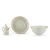 comprising: a bowl with notched rim; a dish with carved floral motif; and a double-gourd formed water dropper with a handle and spout, all similarly glazed in translucent celadon colour (3)