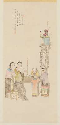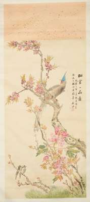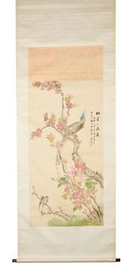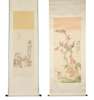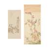 one ink and colour on paper, depicting figures at a table, inscription, signature and seal, dated to Wu Xu year in Guangxu period, 1898AD; and one ink and colour on silk, depicting birds and flowers, with inscriptions, seal and signature, dated to the Ren Yin year of Guangxu period, 1902AD, hanging scrolls (2)