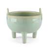 the semi-spherical body supported on three conical tall feet, a pair of looped handles flanked on the mouth rim, covered overall in a pale celadon glaze