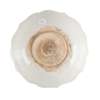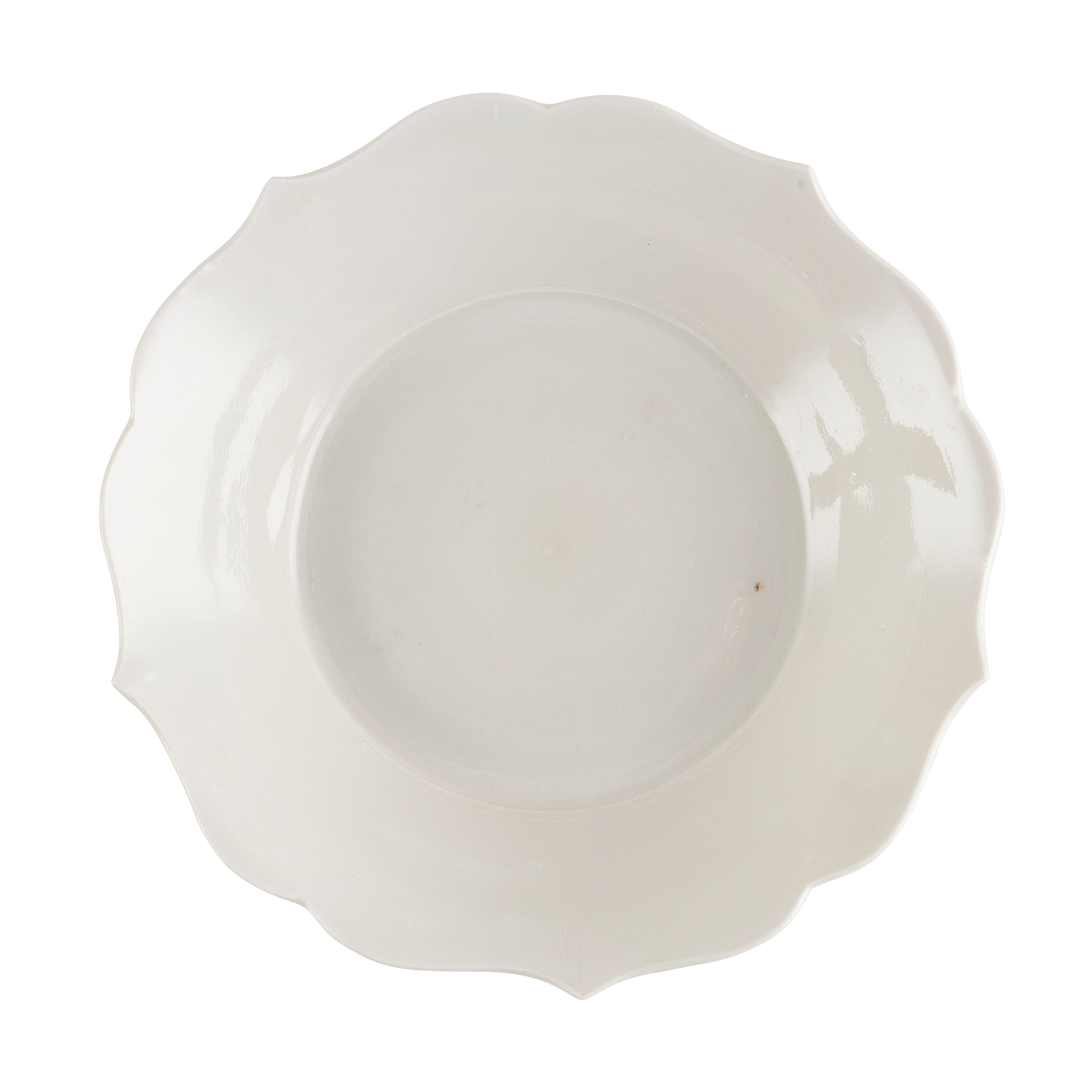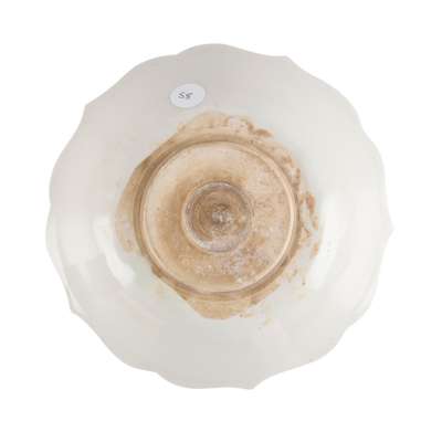 thinly potted, raised on a flattened disc foot to a bared foliate rim, covered overall with creamy white glaze stopping irregularly near the foot