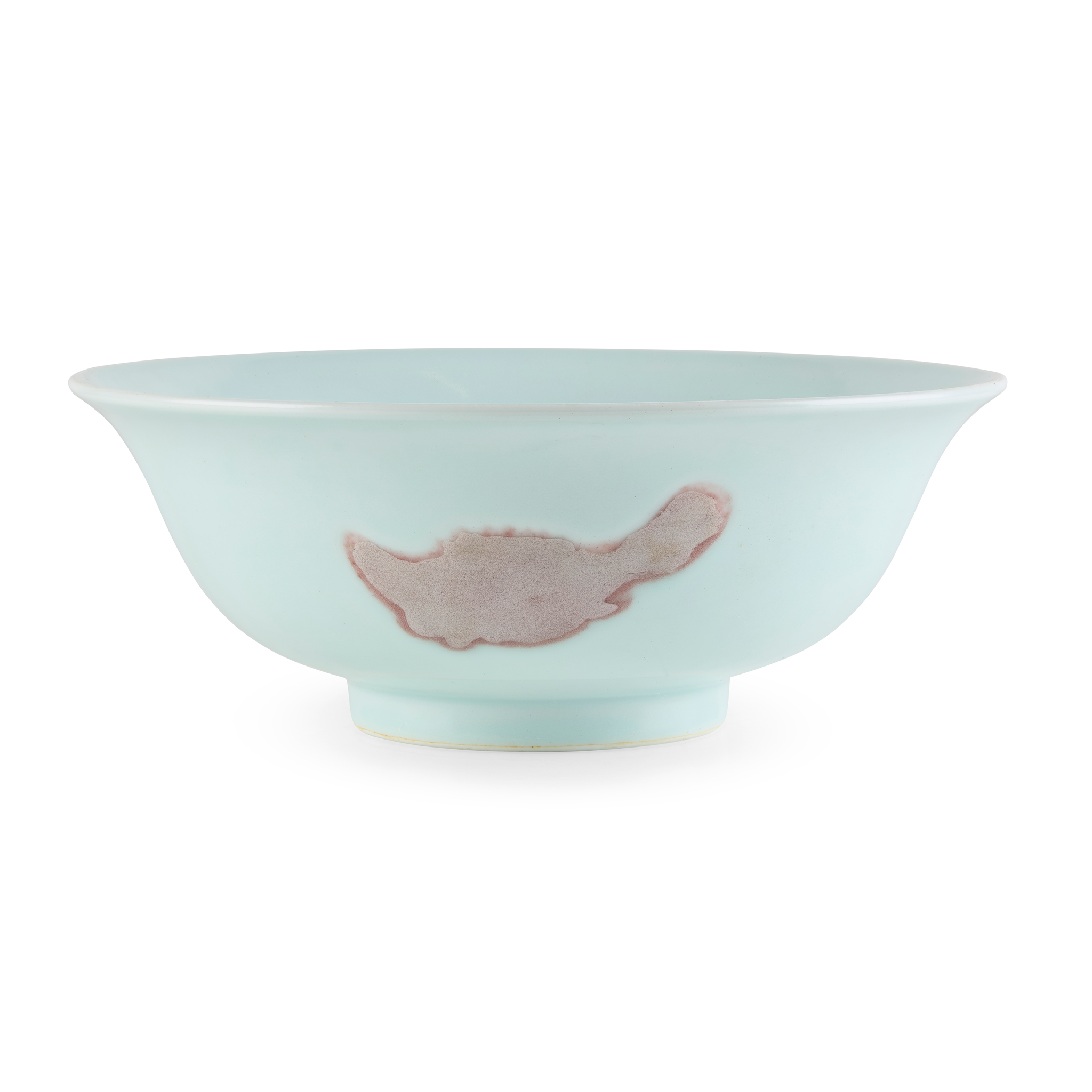 the wide everted sides rising from a short straight foot to a slightly flared rim, decorated around the exterior with three mandarin fish within matted copper-red silhouettes, reserved on an overall white ground, the interior left undecorated, the base inscribed with a six-character Yongzheng mark in double circles in underglaze blue