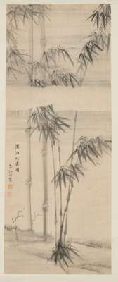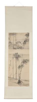 both ink on paper, one depicting bamboo in mist, the other depicting bamboo swaying in the breeze, both with inscriptions and seals, hanging scrolls (2)
