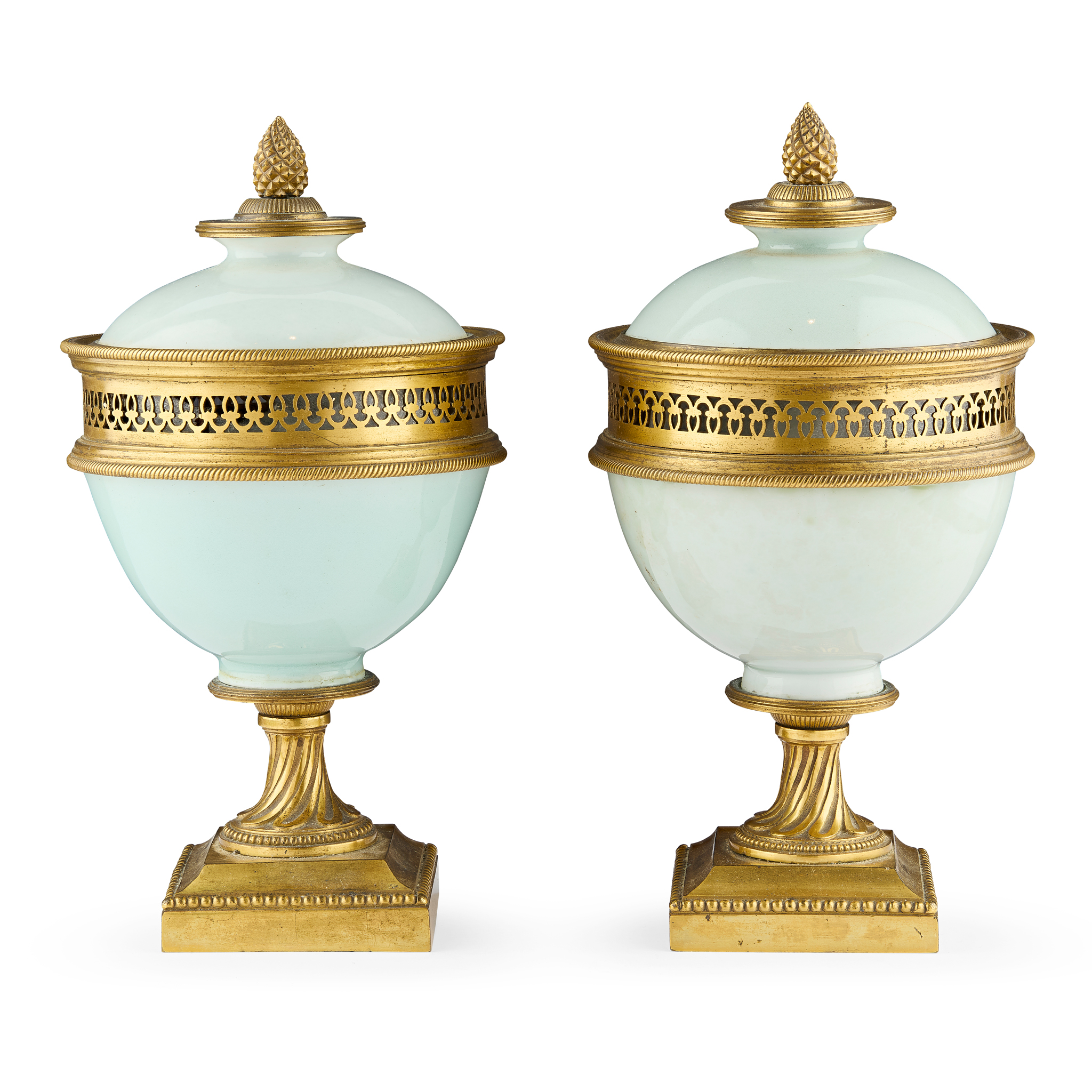 each bowl and cover covered on the exterior with celadon glaze, one of the base inscribed with a four-character Qianlong mark in underglaze blue, surmounted with gilt bronze stand and ornament around the rim and final (2)
