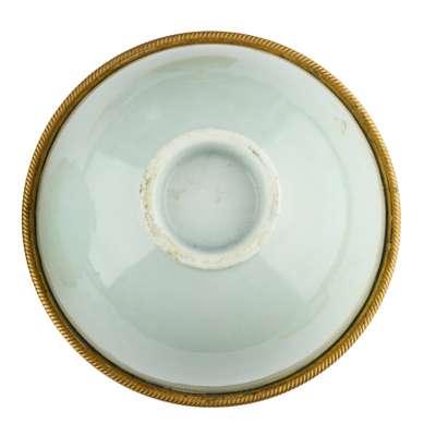 NEAR PAIR OF CHINESE CELADON-GLAZED BOWLS WITH GILT-BRONZE MOUNTS