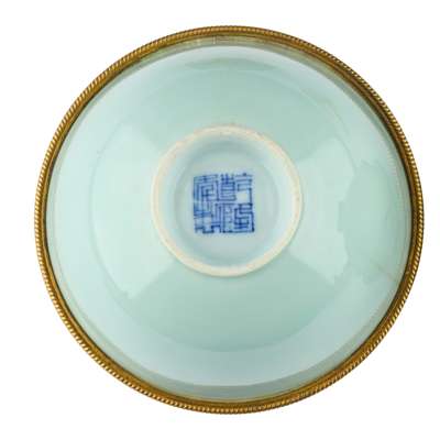 乾隆款 青釉蓋碗後嵌銅鎏金底座及裝飾(共兩件)