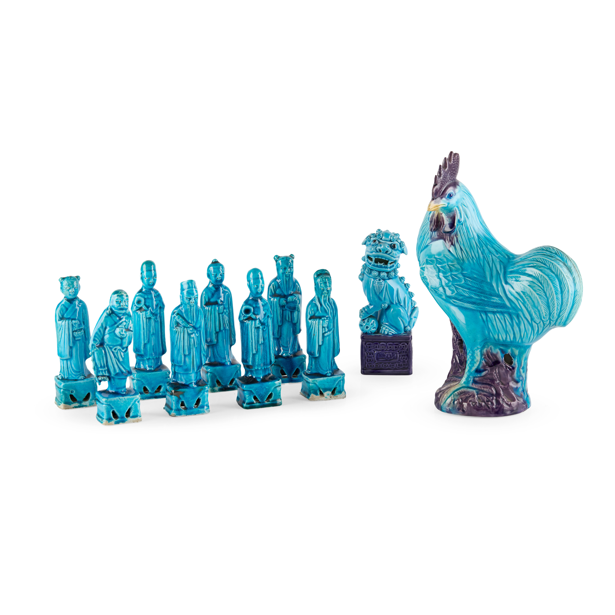 GROUP OF TEN CHINESE TURQUOISE-GLAZED PORCELAIN FIGURES