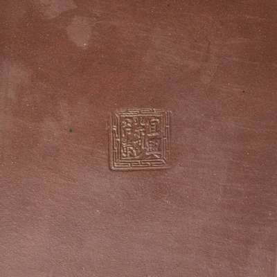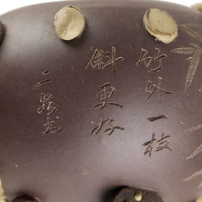 comprising: one of splaying square form, the base with six-character seal mark ‘Yixing zisha minghu’; one of bulbous form with metal handle, the base with a four-character ‘Bao Fengyan zhi’ mark; one moulded with water chestnut as handle, carved with inscriptions on one side; the remaining square-section and moulded ‘vine leaves’ teapots unmarked (5)