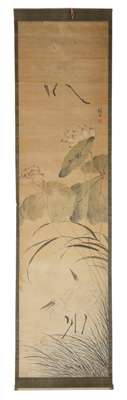 CHINESE INK PAINTING OF A STORK AND LOTUS FLOWERS