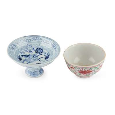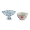 明 青花麒麟花卉紋高足杯 及 礬紅綠彩纏枝花卉紋碗(共兩件)