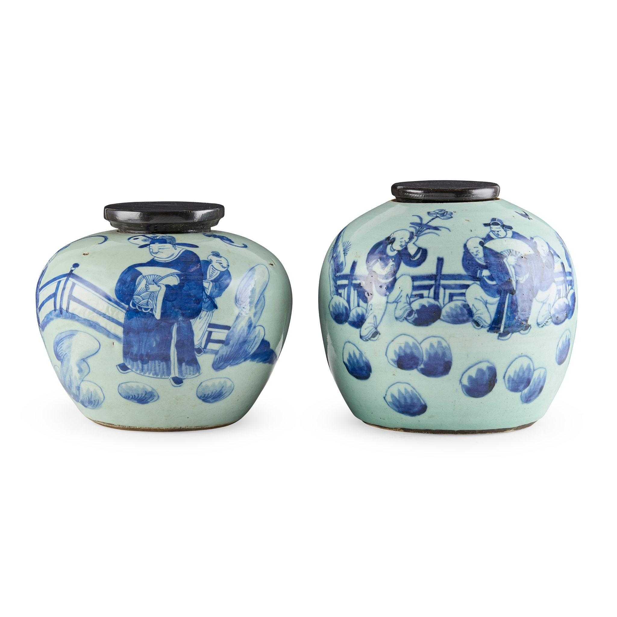 TWO CHINESE CELADON GROUND UNDERGLAZE BLUE 'FIGURAL' GINGER JARS