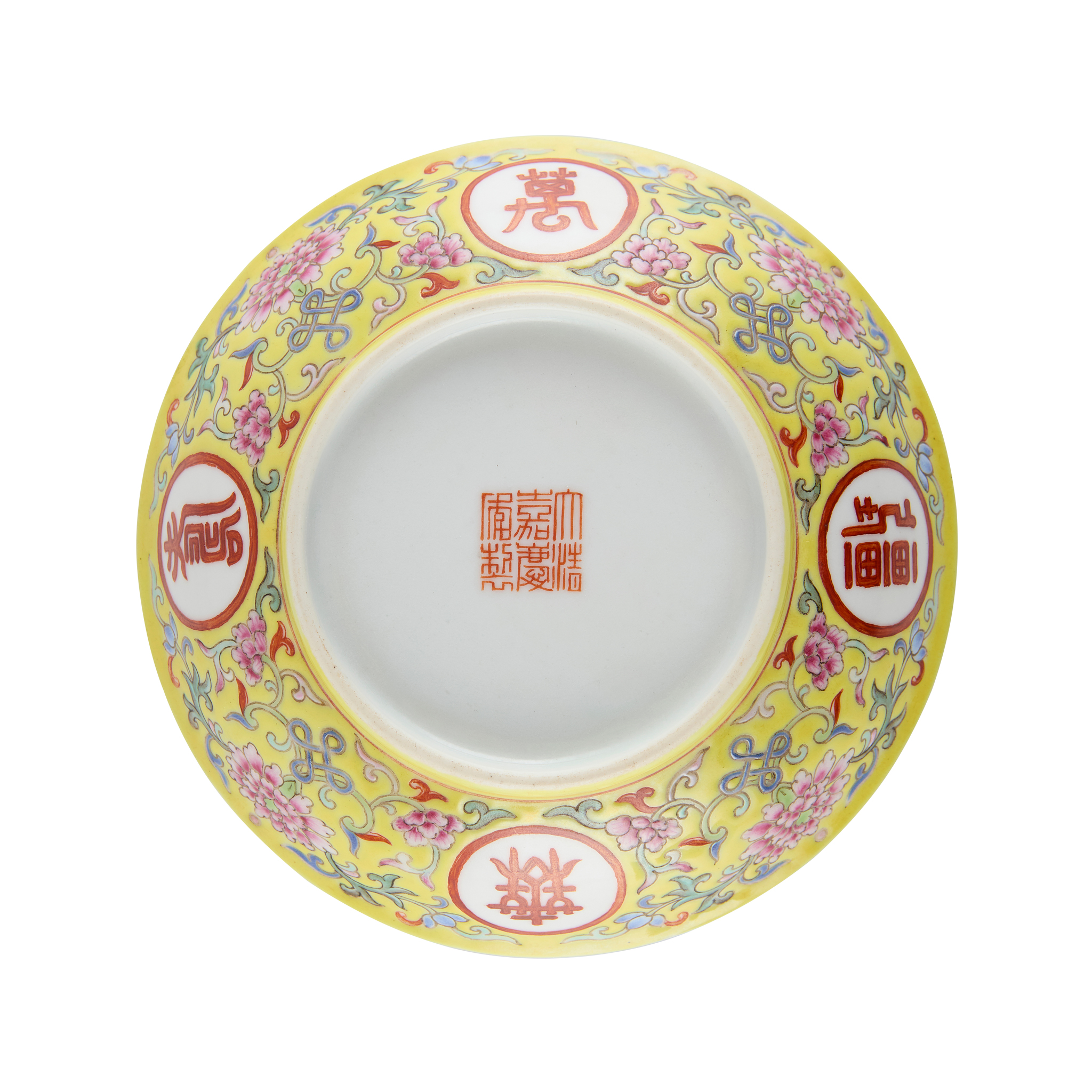 the exterior finely painted with peonies on tendrils between four characters reading ‘Wan Shou Wu Jiang’, meaning ‘Boundless Longevity’, the interior painted with five bats encircling a stylised longevity symbol, the base inscribed with an apocryphal six-character Jiaqing mark in iron red