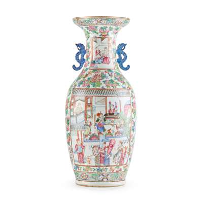 finely enamelled with cartouches enclosing narrative scenes, all reserved on a typical fruit and flowers ground, the neck flanked by a pair of dragon handles