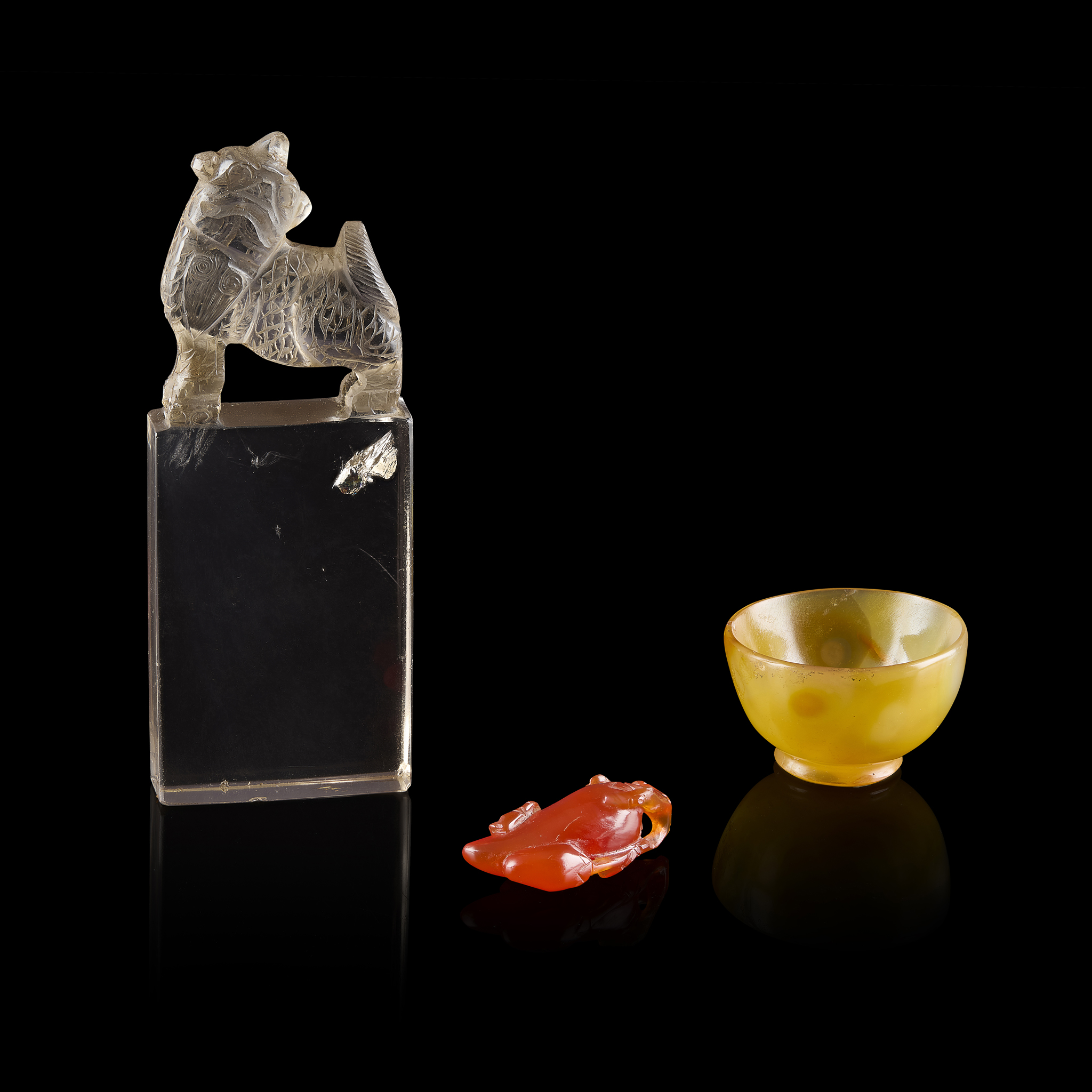 comprising: an agate pendant carved as a chilli borne on foliage, and a cup; and a rock crystal seal, of compressed rectangular form, carved with a seated mythical beast on a tall rectangular plinth (3)