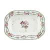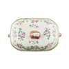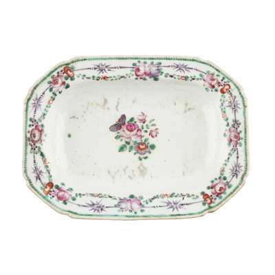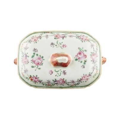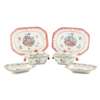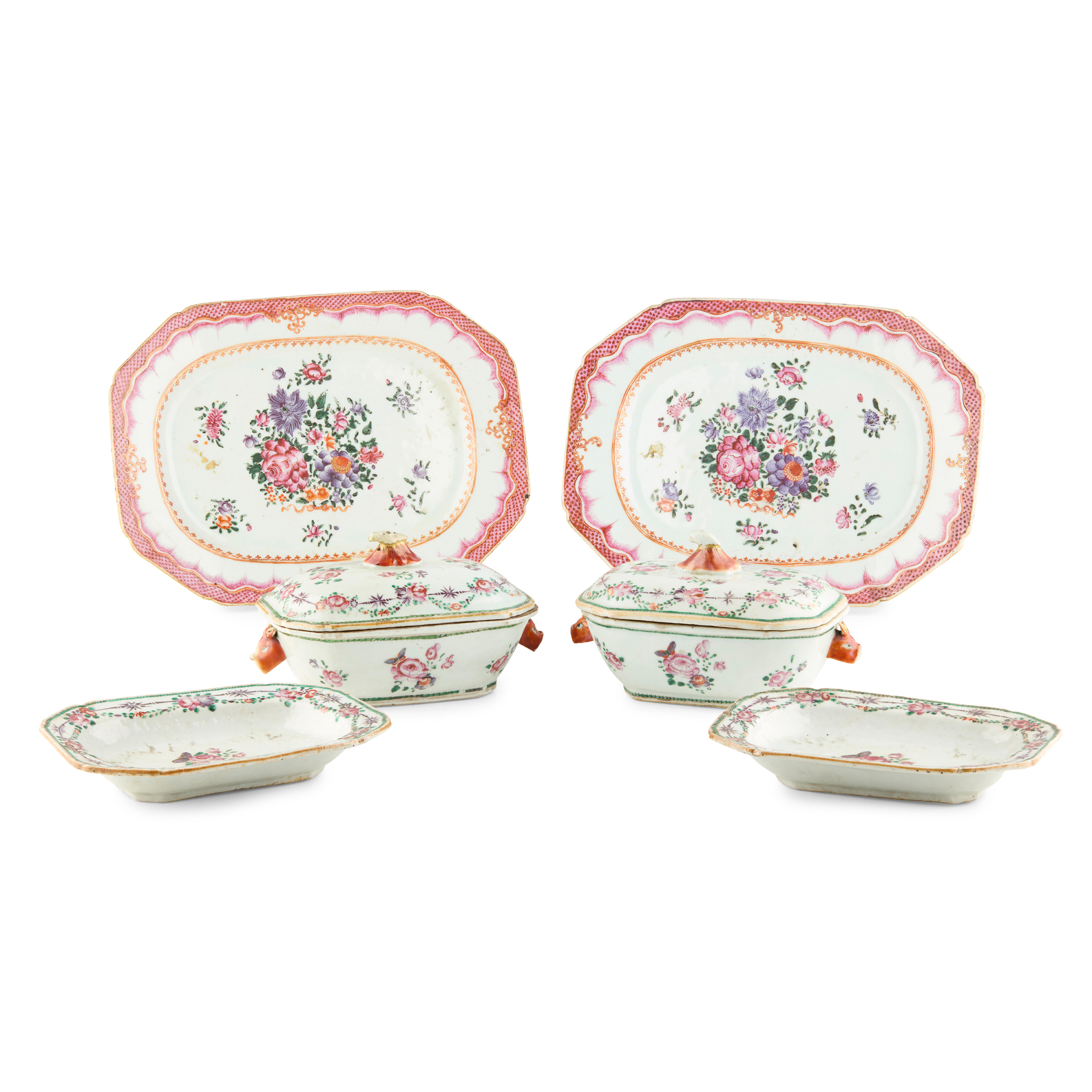 comprising: two small tureens with covers and stands, each with twin mask handles and enamelled with floral and bamboo designs; and a pair of small platters with canted corners, enamelled to the centre with flowers and sprays of flowers within a ruyi head border, the rims with puce diaper designs (8)