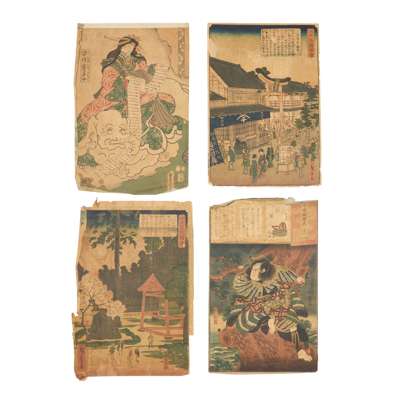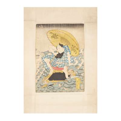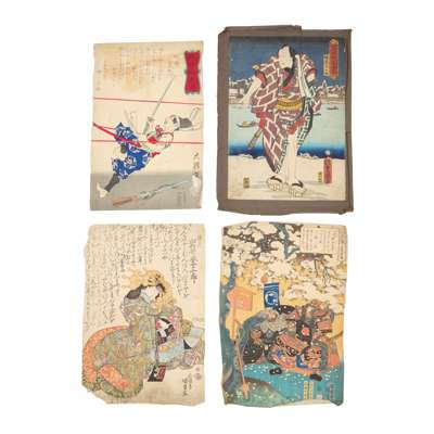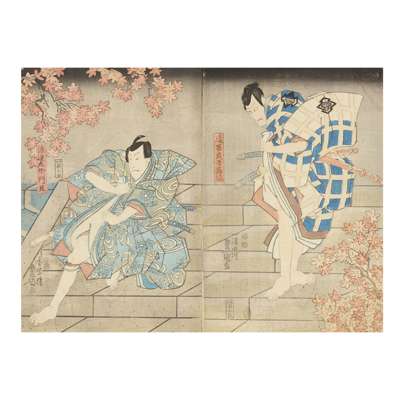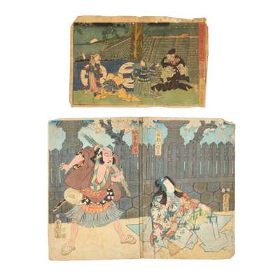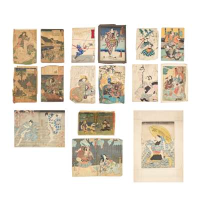 comprising: one Actor as Banzuiin Chobei, 1859, from the series of Full-length Mirror of a Hit from the Present-day (Jidai sewa atari sugatami), one Mitate Fugen, one Mitachi Rain?, one of a triptych, The actor Iwai Kumesaburo in the role of the courtesan Agemaki, one diptych depicting kabuki characters, all by Utagawa Kunisada (1786-1865); two prints depicting kabuki characters, one kabuki scene, all by Utagawa Toyokuni (1769-1825); one print from the series Edo Meisho Zue, one Kuramae Hachiman Shrine, both by Utagawa Hiroshige II (1826-1869); one Bandó Džutaró I. jako Šinbei z hostince Jodo, by Šigeharu Rjúsai (1802-1852); one diptych of Act 1, from the series 11 Acts of New Treasury of Loyal Retainers, by Utagawa Kuniteru (ac 1818–1860); one The Hour of the Tiger, Oyodo of the Tsuru, by Kikugawa Eizan (1787-1867); one Modern Parodies of Genji / Ch. 18, Matsukaze: Higuchi Jiro, by Utagawa Yoshiiku (1833-1904); one kabuki scene by Utagawa Kuniyoshi (1798-1861); one Kashiwase Moemon’ from series 'Keisei suikoden (Biographies of Valiant Drunken Tigers)', by Tsukioka Yoshitoshi (1839-1892); and one Boys festival, fifth of the fifth lunar month, by Keisai Eisen (1790-1848) (19)