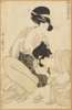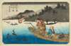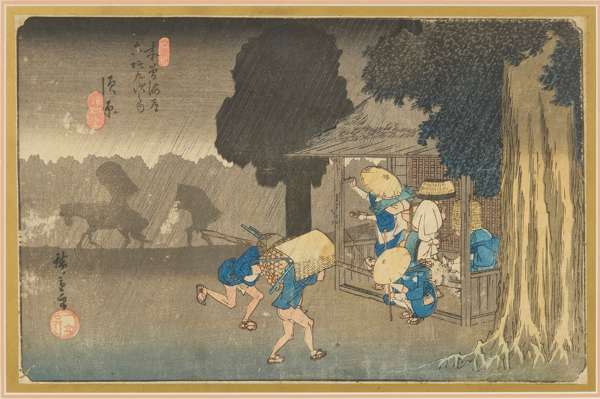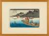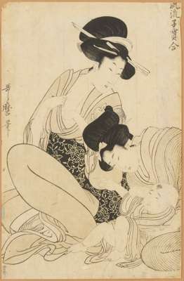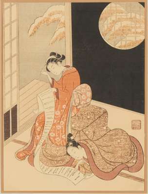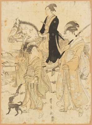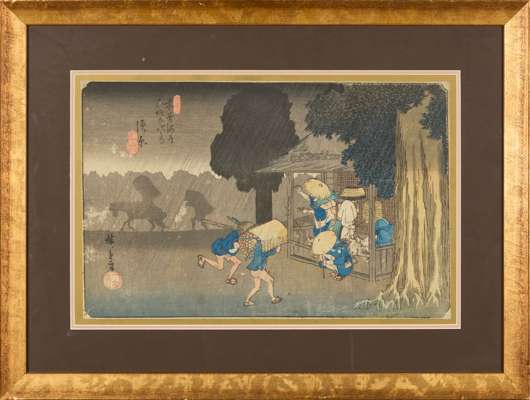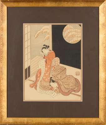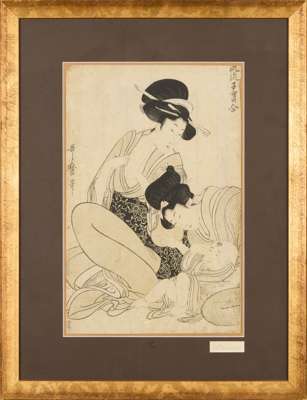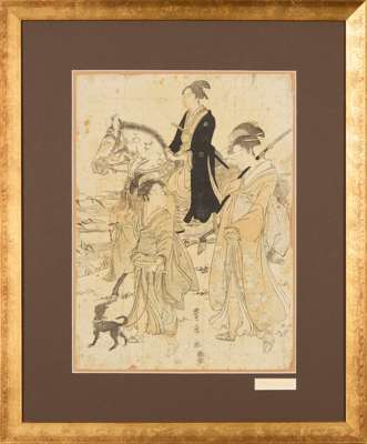 comprising: a centre of a triptych, ‘party of hawkers by a river, with young man on horse and ladies with pantaloons under kimono’, by Utagawa Toyohiro (1773-1828); a ‘Suhara’, from the series ‘Sixty-nine Stations of the Kisokaidō’, by Utagawa Hiroshige (1797-1858); a ‘Parody of Chūshingura: A Couple Reading A Letter’ (Mitate Chūshingura: Fumi yomu danjo), Suzuki Harunobu (1725-1770); a ‘Godo Nagae [Nagara]-gawa ukai fune’ (Cormorant-fishing Boats on the Nagara River at Godo), from the series Kisoji no eki (The Stations of the Kiso Road), by Keisai Eisen; and an oban tate-e bijinga print depicting a mother about to breastfeed her infant son from the series Furyu kodakara awase (Fashionable Comparisons of Precious Children), by Kitagawa Utamaro (1753-1806), all framed (5)