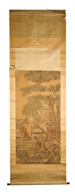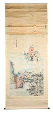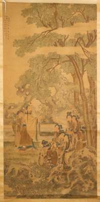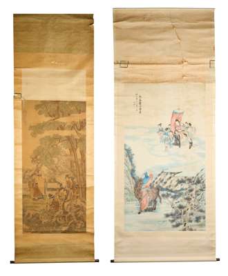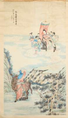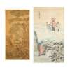one ink and colour on paper, depicting Guo Ziyi with female immortals, with inscriptions, seals and signature; the other ink and colour on silk, depicting Emperor Tang Xuanzong with palace ladies, with inscriptions, seals and signature, dated to the Daoguang Xin Mao year, corresponding to 1831AD, hanging scrolls (2)